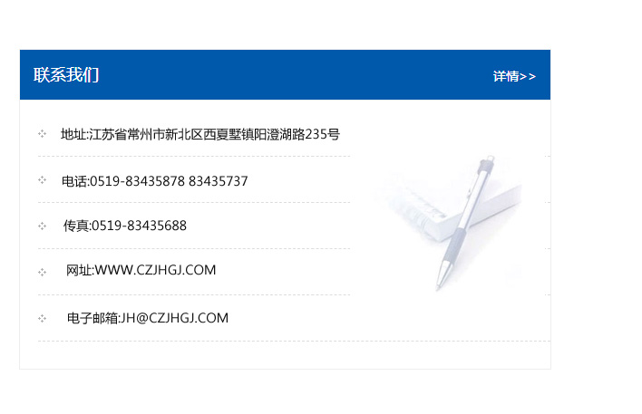 地址:常州市新北區友邦商務大廈1幢16、17層  電話:0519-85101652  傳真:0519-85112595  郵編:213022  網址:www.cz-jiayue_cn.lcwtwz.com  郵箱:xiajifengaa@163.com